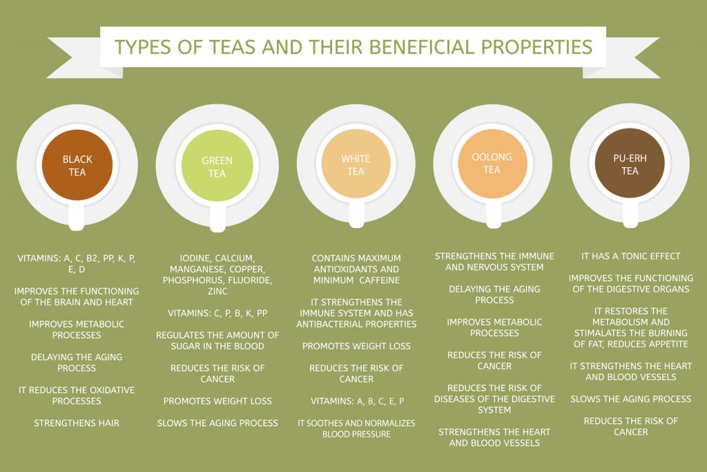 À ce jour, cinq variétés de thé présentant chacune des spécificités ont été recensées, soit le thé vert, le thé noir, le thé Oloong ou le thé bleu, le thé rouge, et le thé blanc. Ces variétés possèdent des propriétés thérapeutiques communes dont :